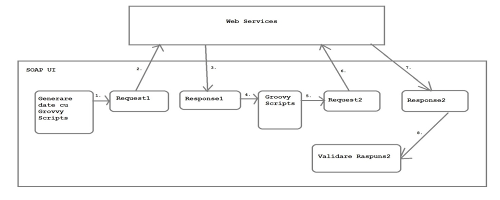 Pentru a pune în practică abordarea cascadă, folosind Groovy Script, am creat o serie de metode ajutătoare care sunt apelate în cadrul test case-urilor. Aceste metode ajutătoare generează test case-uri tipizate pentru toate metodele unui serviciu, generează date de un anumit tip, copiază datele din răspuns într-un pas de tipul Properties (câmp - valoare), copiază date dintr-un pas în altul, creează validări mai complexe, etc. .