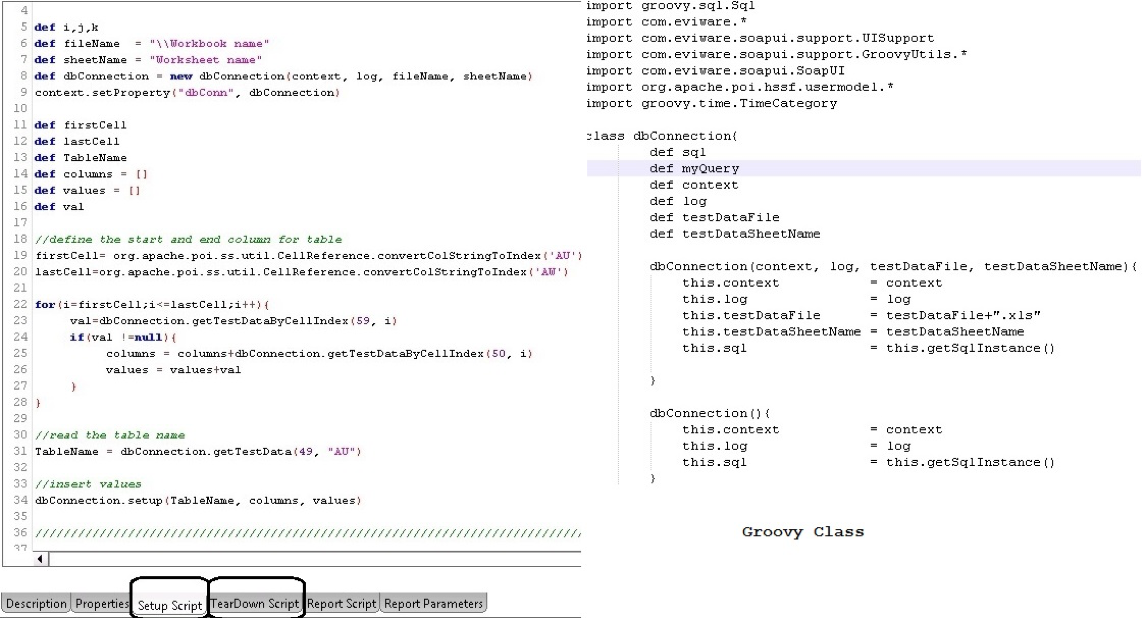 În funcţie de specificul proiectului, poate fi necesară inserarea sau ştergerea direct din baza de date. În acest sens, folosim Setup script şi Tear down script existente în fiecare Test case. Datele de intrare şi cele de validare a răspunsului sunt organizate într-un fişier Excel. Funcţiile Groovy necesare pentru stabilirea conexiunii la DB, pentru manipulare date, pentru ştergere conexiune, sunt grupate într-un fiser groovy script. Pentru a putea accesa baza de date din cadrul SOAP UI este nevoie de driver-ul ojdbc6 .jar. Driver-ul trebuie copiat în locaţia directorInstalareSOAPUI \jre\lib\ext. Pentru ca execuţia testelor să fie foarte rapidă, fiecare metodă care se testează are propriul fişier cu date de test. Pentru un serviciu vom avea atâtea fişiere Excel câte metode sunt pe serviciu.
