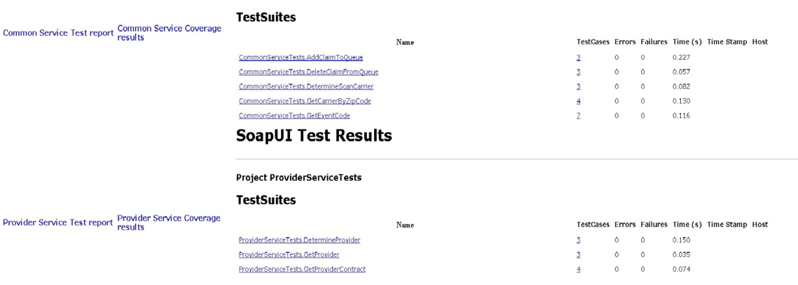 Un exemplu de raport primit pe email este prezentat în figura de mai jos. Emailul conţine statusul per fiecare serviciu/per fiecare metodă din serviciu, cât şi link-uri către raport general şi de coverage pentru fiecare serviciu în parte.