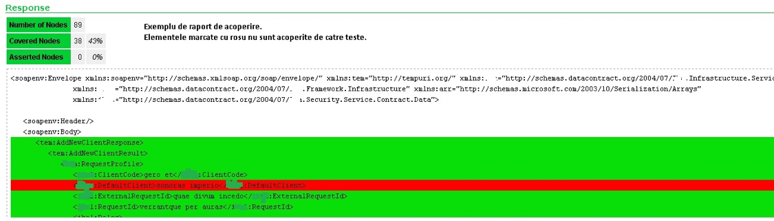 Pentru a avea un grad mare de acoperire a elementelor din contract, se trimite request-ul cu toate elementele având date valide şi se crează assert-uri pe fiecare element din răspuns. În funcţie de validarea dorită, se selectează unul din assert-urile standard sau folosind Groovy Script se pot crea assert-uri mai complexe. Pentru validarea conţinutului datelor din răspuns, comparăm datele generate şi stocate într-un pas de tipul Properties cu cele întoarse în răspuns.