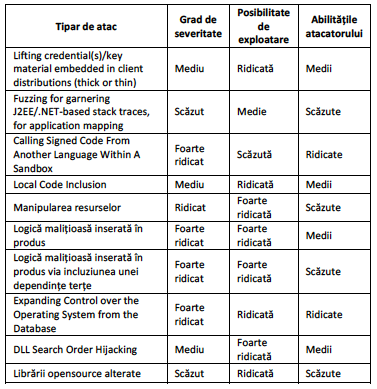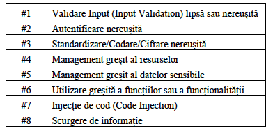 În continuare, am identificat CWEs (Common Weakness Enumeration/Enumerarea Vulnerbilităților Comune) care sunt mapate pe cele 27 de tipare de atac identificate în baza de date CAPEC și care sunt asociate cu vulnerabilitățile din librării. Aceste slăbiciuni sau vulnerabilități permit ocurența tiparelor de atac. Am clasificat aceste vulnerabilități în opt categorii majore (vezi tabelul 2).