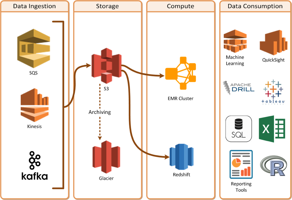 Partea de procesare, clar delimitată de stocare, se poate realiza într-unul sau mai multe clustere EMR (Amazon Elastic MapReduce, distribuția oficială de Hadoop din AWS). Acesta are avantajul că poate scala, adăugând mai multe noduri la nevoie. Totodată, EMR suportă și alte framework-uri distribuite, precum Apache Spark sau Presto. Este posibil totuși ca S3 și EMR să nu înlocuiască total nevoia unui Data Warehouse clasic, în special când vorbim de modele dimensionale; aici Amazon vine cu un produs numit Redshift - un Data Warehouse ultrarapid și administrat automat, care scalează la nivel de petabytes.