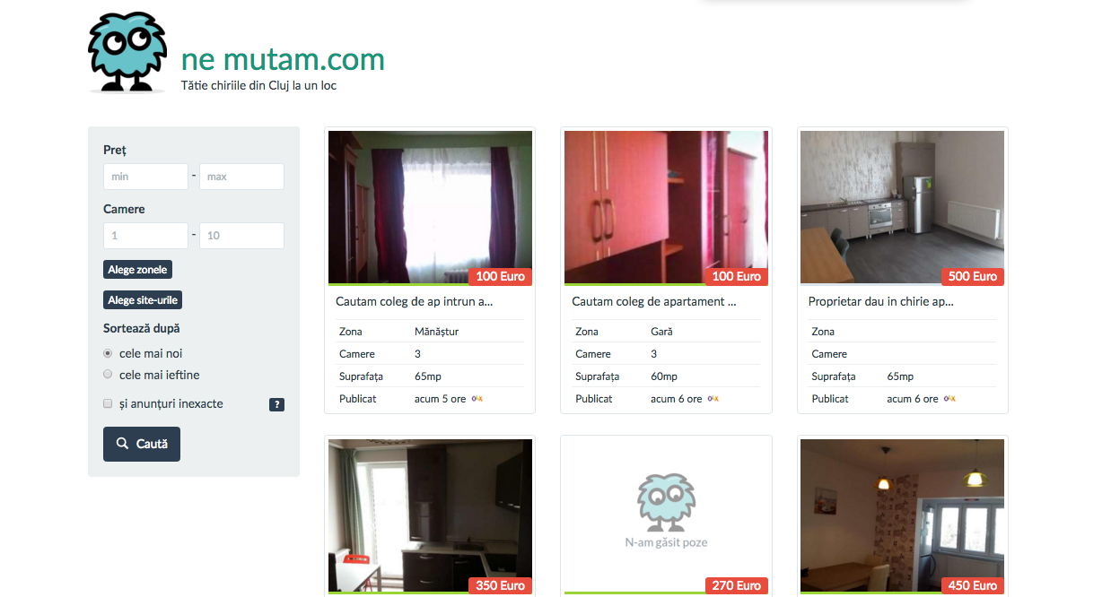 "Dacă ți-o trebuit vreodată chirie la Cluj sigur te-ai distrat de minune verificând zile în șir site-urile de mai jos, sperând să găsești un apartament fain. Mno, noi ne-am decis să le punem pe toate la un loc, ca să-ți fie mai ușor. Și dacă ți-e chiar incredibil de foarte lene, zi-ne ce-ți trebe și te anunțăm noi când apare ceva nou."