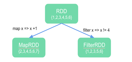 Pentru cazul transformării de tip « map », din imaginea de mai jos, Spark iterează distribuit pentru fiecare element şi incrementează valoarea cu o unitate, rezultând astfel un nou RDD, numit MapRDD.