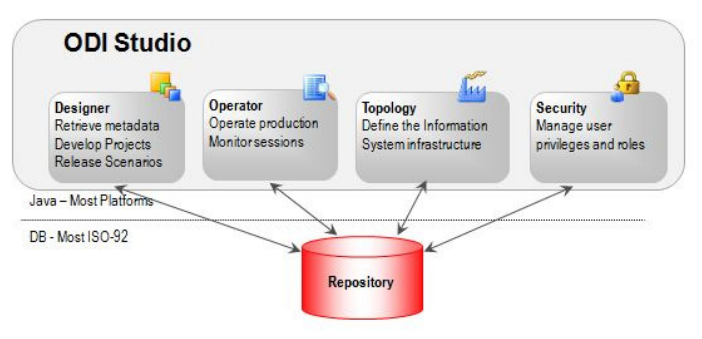 O platformă de integrare a datelor completă, ce satisface toate cerinţele: volum mare de date, performanță şi paralelism. ODI 12c folosește o arhitectură E-LT pentru a garanta o performanță cât mai mare, dar şi pentru un cost cât mai mic. Diferenţa majoră dintre o arhitectură ETL şi una E-LT este prezenţa serverului ETL aşa cum se observă în imaginea de mai jos: