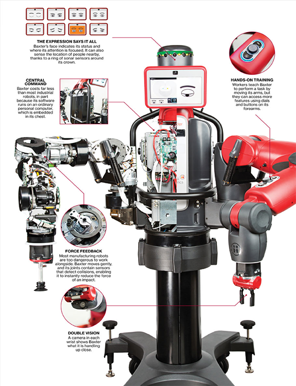 Un membru important al acestei familii de roboţi este Baxter, creat de firma RethinkRobotics. Fondatorul lui, Rodney Brooks, este co-fondator şi a fost CTO la firma iRobot, cea care a produs celebrul robot-aspirator Roomba şi roboţi militari destul de înfricoşători. Precum iRobot, Rethink Robotics construieşte roboţi cares sunt gata de vânzare, spre deosebire de roboţii industriali mari sau cei folosiţi în cercetare (e.g. Honda ASIMO). Compania vinde accesorii şi garanţii extinse pentru produsele sale.