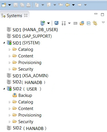 În HANA Studio, administratorii sau programatorii se pot conecta simultan la mai multe servere, cu utilizatori diferiți. Acest lucru este benefic în cazul în care lucrăm la proiecte diferite pentru clienți diferiți. În figura de mai jos putem vedea cum, din HANA Studio ne putem conecta, la mai multe Sisteme HANA (SID - System ID) folosing diferiți User-i(SYSTEM, SAP_SUPPORT, HANADB, etc.).