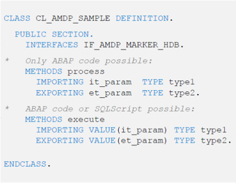 O condiție ca într-o clasă să putem implementa AMDP-uri este ca clasa respectivă să conțină interfața IF_AMDP_MARKER_HDB. Vezi Figura 3.