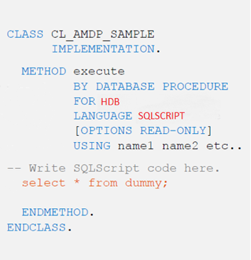 ABAP Managed Database Procedure - este o nouă caracteristică în AS ABAP( Application Server ABAP) care ne permite să scriem proceduri de stocare direct în ABAP. Aceste proceduri pot fi private ca funcții stocate și executate în baza de date. Limbajul folosit pentru ele este SQL Script. Mai exact codul SQL Script este scris în metodele claselor și executat în HANA.
