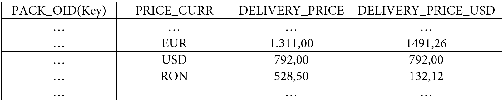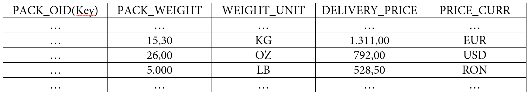 Să presupunem că firma Siemens AG are o companie fiică Siemens Logistics care are ca activitate livrarea de colete între companiile Siemens. Atunci, în baza de date a sistemului ERP, ar exista o tabelă cu informații despre pachetele livrate în anul fiscal 2015. Pentru simplitate, am ales ca tabela noastră să conțină doar cinci câmpuri. Vezi Figura 6.