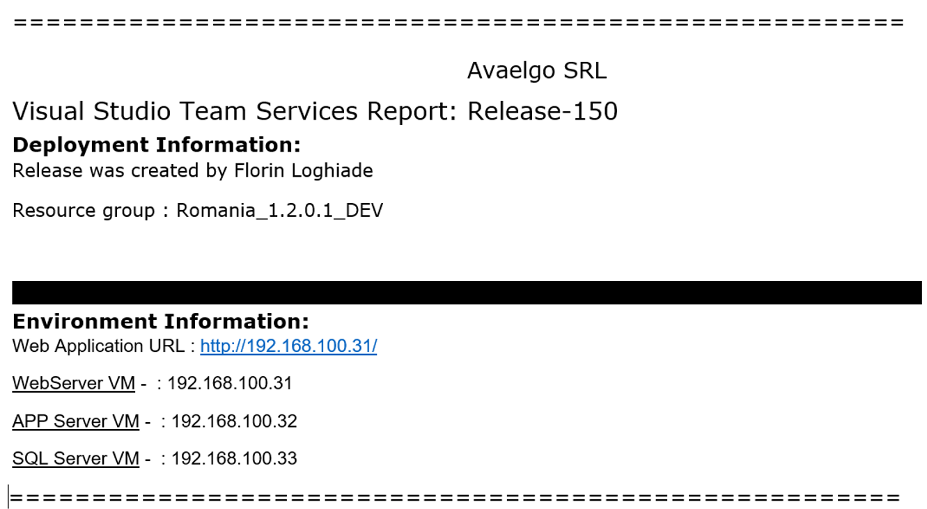 Atunci când instalăm soluția într-un mediu Dev / Test dorim să notificăm persoanele interesate atunci când operațiunea s-a încheiat: release manager, tester, etc. .Confirmarea poate să fie sub forma unui e-mail în care tester-ul are URL-ul aplicației care trebuie testată și alte informații utile. Exemplu: