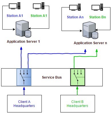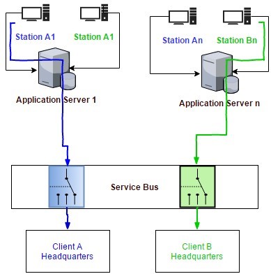 Infrastructura simplificată arată asemănător acestei imagini. Acest model se poate multiplica la nivelul zecilor sau al sutelor. Pentru a simplifica lucrurile, am păstrat aici doar trei stații a trei clienți diferiți. Am putea avea scheme multiplicate de sute sau mii de ori.