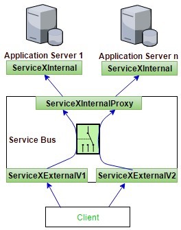 În aceste situații aveți nevoie de versionare inteligentă. ServiceX_v1, ServiceX_v2 ar putea fi același serviciu din perspectivă funcțională, având doar unul sau mai multe câmpuri diferență în livrarea mesajelor. Din perspectiva ESB, acestea pot fi tratate drept servicii diferite. Totuși, este posibil să se definească un serviciu proxy intern și unul extern pentru același serviciu. Serviciul Proxy extern se comportă ca și cum știe doar 'definiția externă' în timp ce Proxy-ul intern știe doar 'definiția internă'.