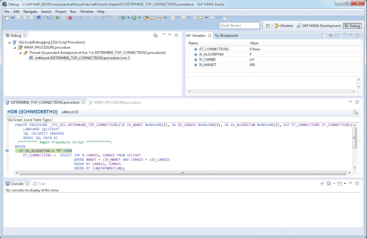 Debuggerul de SQL Script este ultimul instrument pe care îl vom aborda în legătură cu analiza erorilor legate de instrucțiunile SQL. Pentru a folosi debuggerul avem nevoie de perspectiva DEBUG și SAP HANA DEVELOPMENT din SAP HANA Studio( vezi Figura 2). Pentru a naviga la următorul breakpoint folosim RUN -> RESUME, iar pentru a termina execuția RUN -> TERMINATE.
