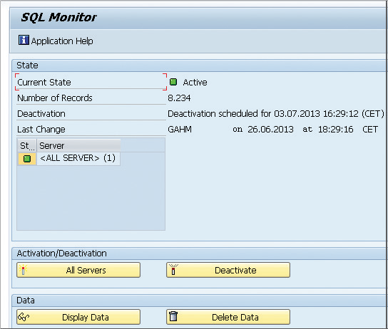 Monitorul SQL este un instrument menit să colecteze, să agregheze și să stocheze informații legate de execuția instrucțiunilor SQL. Acest monitor trebuie activat în sistemul productiv și lăsat să ruleze pentru o perioadă mai lungă, de obicei 5-6 săptămâni, ca să cuprindă toate procesele dintr-o firmă, cum ar fi procesele legate de sfârșitul de lună fiscală. Pentru a activa acest monitor se rulează tranzacția SQLM ca în Figura 8.