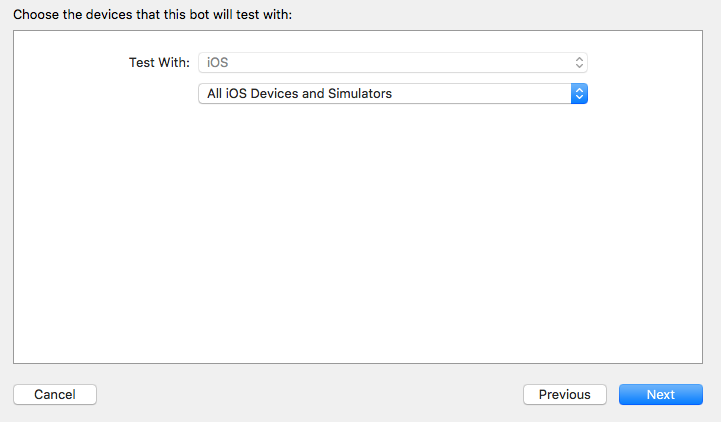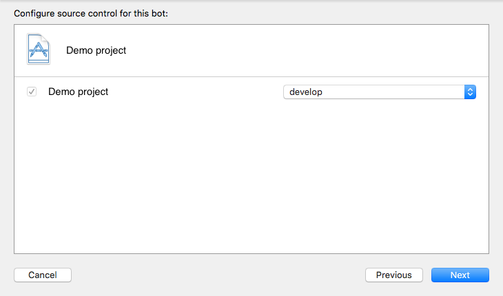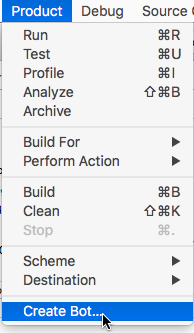O dată ce serverul Xcode este configurat se poate crea un bot pentru un anumit proiect prin deschiderea proiectului respectiv, apoi din meniul Product se alege opțiunea Create Bot
