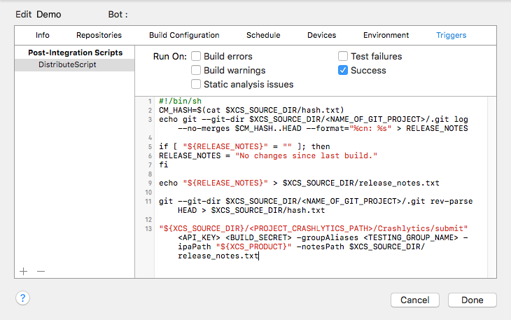 "${XCS_SOURCE_DIR}/<PROJECT_CRASHLYTICS_PATH>/Crashlytics/submit" <API_KEY> <BUILD_SECRET> -groupAliases <TESTING_GROUP_NAME> -ipaPath "${XCS_PRODUCT}" -notesPath $XCS_SOURCE_DIR/release_notes.txt