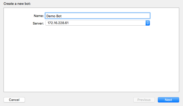 În primul rând noul bot are nevoie de un nume, apoi trebui specificat o adresă IP care reprezintă adresa mașinii unde serverul mac OS rulează.