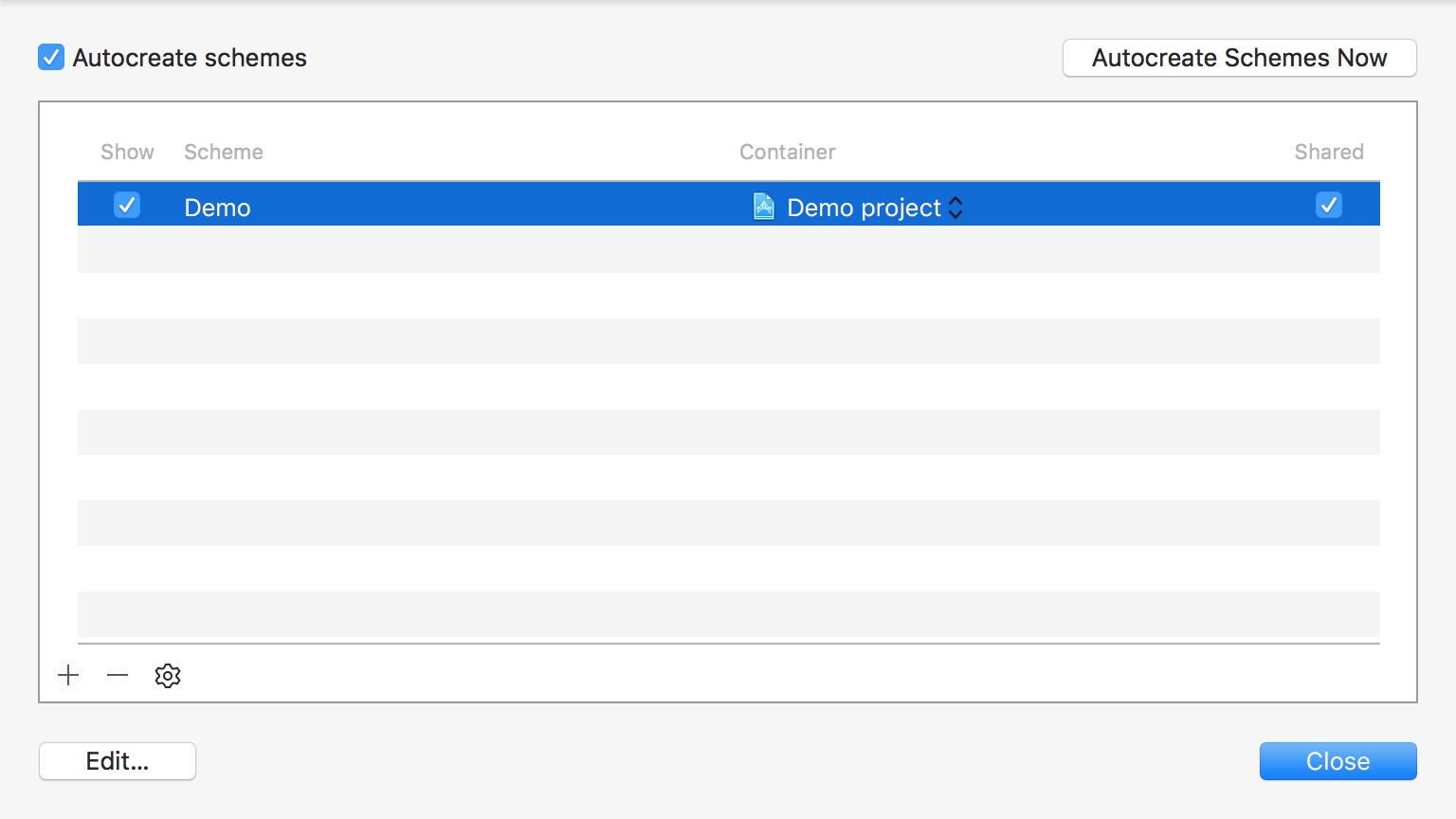 Următorul ecran, ilustrează opțiunile de configurare pentru crearea pachetului de instalare. Conform documentației de la Apple, schema agregă mai multe ținte de creare, o configurație de creare și teste de executat. Vizibilitatea schemei trebuie să fie publică pentru a fi vizibilă în botul Xcode.
