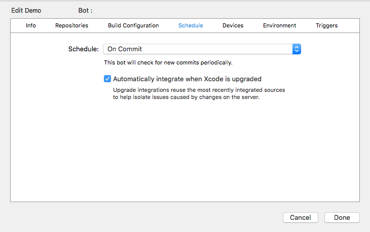 Următorul pas este de a decide când botul Xcode va crea pachetul de instalare. Am selectat opțiunea "On Commit", deoarece vrem ca de fiecare dată când o ramură, ce conține funcționalități noi, este integrată în ramura principală, un nou pachet de instalare să fie creat. Chiar dacă există multe opțiuni la categoria "Schedule" la finalul wizardului, botul va executa o integrare, indiferent de opțiunea aleasă. Acest lucru se va întâmpla o singură dată după ce botul a fost configurat. Ulterior se va respecta opțiunea aleasă în Schedule.