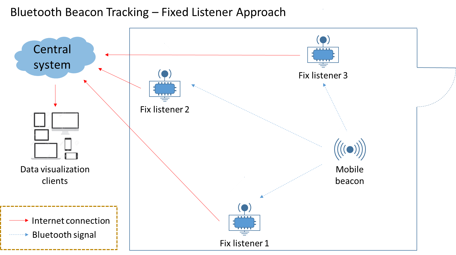 Abordarea cea mai uzuală utilizează dispozitive beacons fixe amplasate în poziţii coordonate, relative la o hartă indoor. Dispozitivele mobile cu Bluetooth recunosc beaconurile când se află în raza de acţiune și determină poziţia dispozitivului pe hartă, utilizând puterea semnalului dobândit pentru a măsura distanţa și a ști care este plasarea beaconurilor.