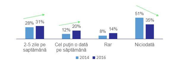 În 2016, comparativ cu 2014, procentul celor care merg cu bicicleta la serviciu, tot mai des, este în creștere, respectiv al celor care nu merg niciodată este în scădere.