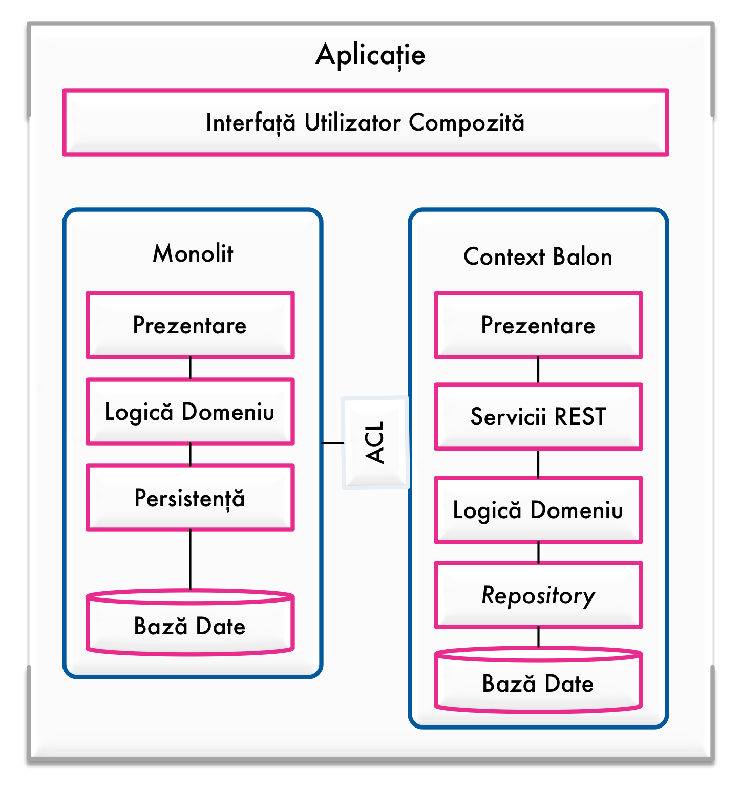În definiția Domain Driven Design un context delimitat deține responsabilitatea pentru întreaga partiție verticală de funcționalitate de la nivelul de prezentare prin cel de logică a aplicației și până la stocarea datelor.