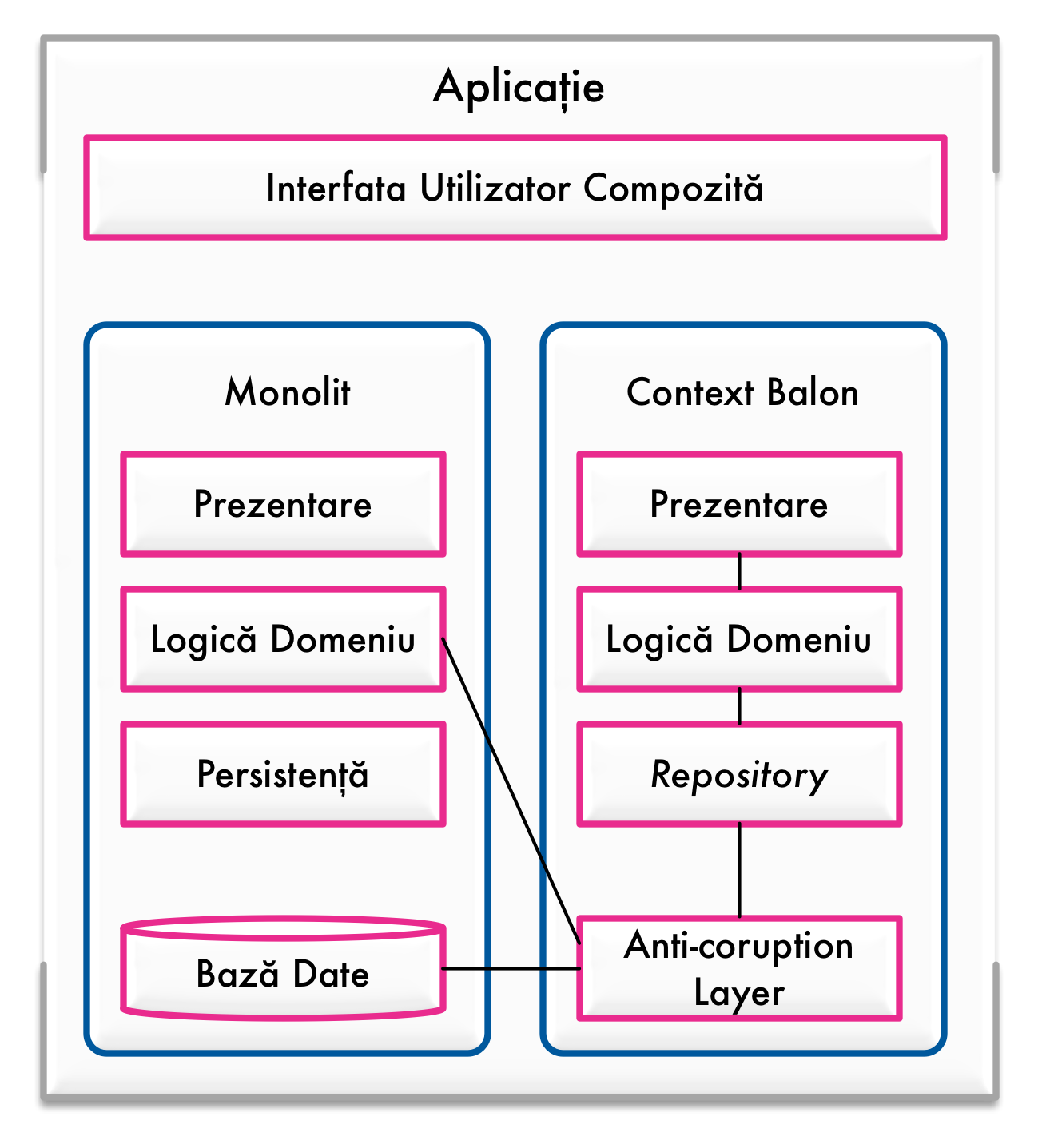 Funcționalitatea nouă poate fi modelată fără constrângeri iar integrarea în aplicația existentă se va face prin intermediul bazei de date și a serviciilor existente în monolit. În această idee, nu vom crea o bază de date nouă pentru contextul nou stabilit ci vom interoga baza de date folosită de monolit, dar vom rearanja datele corespunzătoare noilor modele. DDD folosește tiparul repository pentru a abstractiza operațiunile de acces la date. În acest fel se justifică implementarea stratului anti-corupție în cadrul acestui repository.