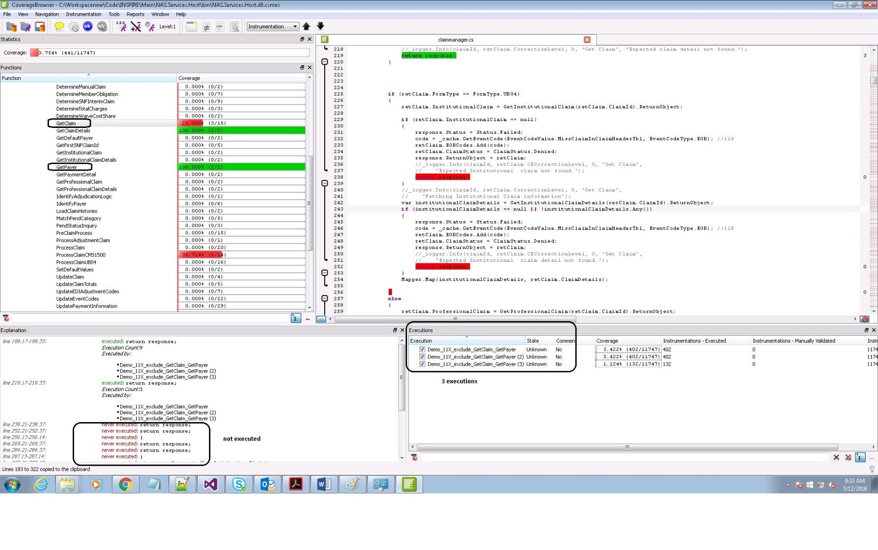 Când aplicaţia este exersată, rezultate pentru code coverage sunt generate pentru fiecare execuţie - fişiere cu extensia .CSEXE Aceste rezultate pot fi vizualizate folosind CoverageBrowser.