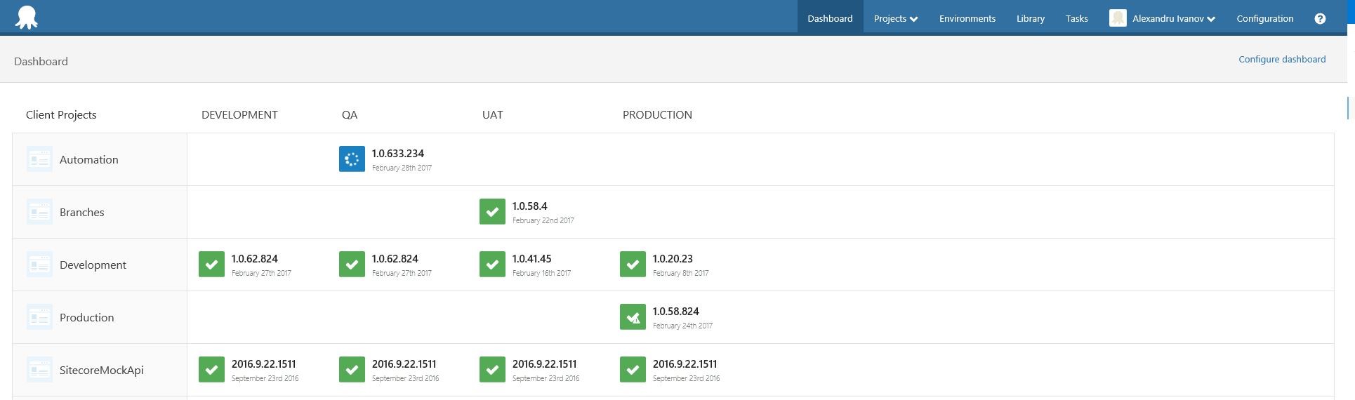 Toate distribuțiile în același loc - Panoul principal al Octopus Deploy este foarte intuitiv, permițând vizionarea fiecărui chiriaș (eng. Tenant) care accesează serverul Octopus, cât și al fiecărui pachet distribuit către fiecare environment în parte.