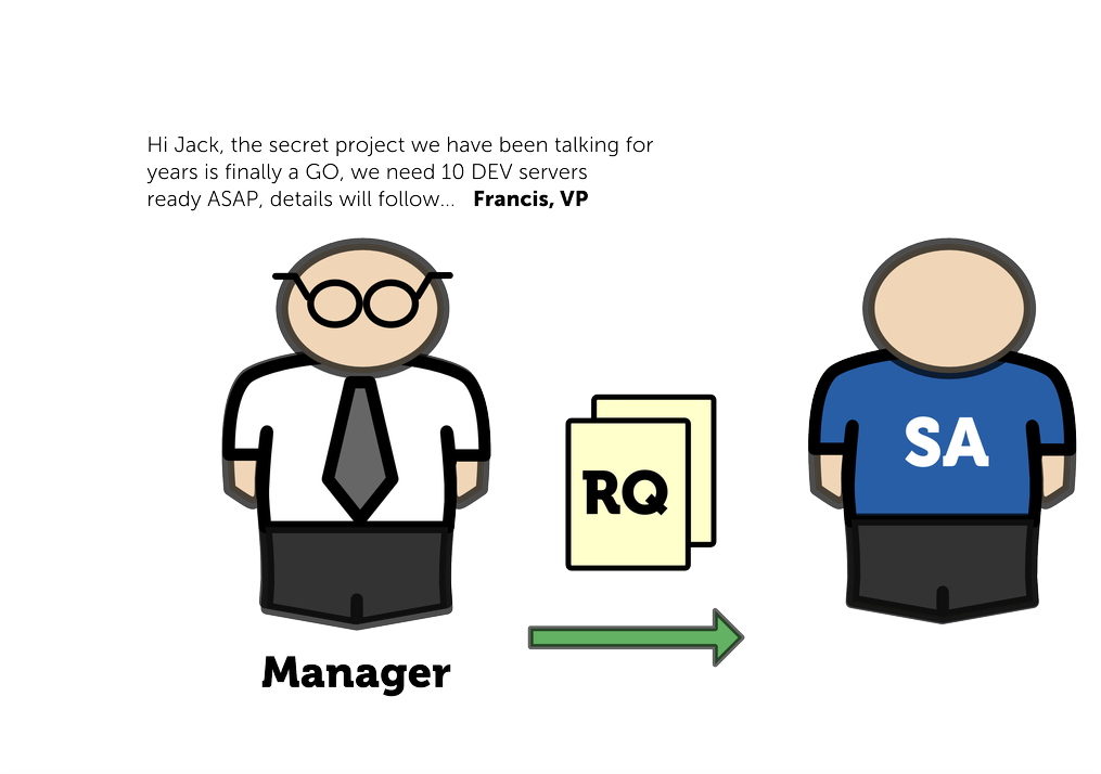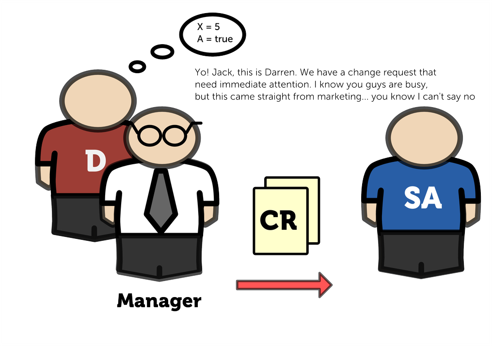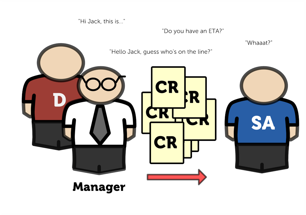 Dezvoltatorii nu știu cine este Jack și nici unde este biroul lui. Singura soluție prin care pot schimba ceva în medius (în sens "oficial") este de a raporta managerului, care va folosi un sistem de identificare a problemelor organizației pentru a depune un ticket la Departament de operațiuni, de unde Jack îl va ridica. Pentru a accelera procesul, managerul de proiect trimite un e-mail și lui Jack.