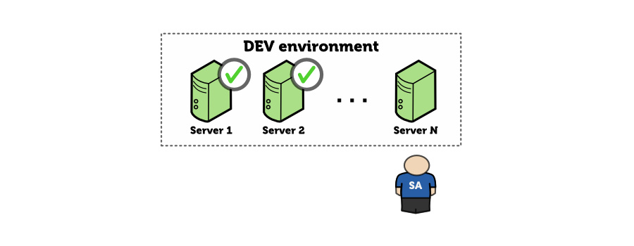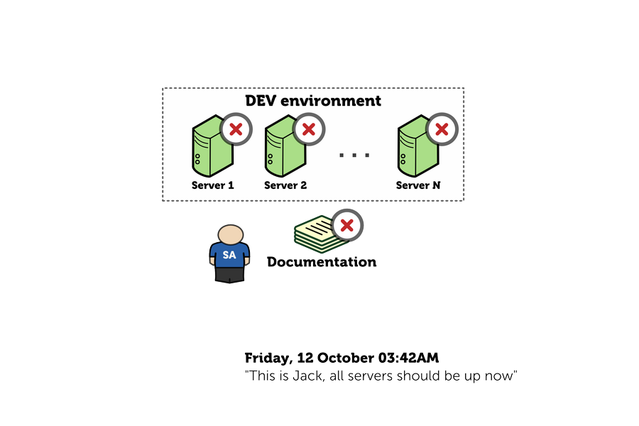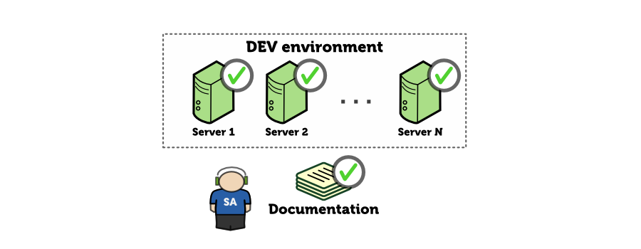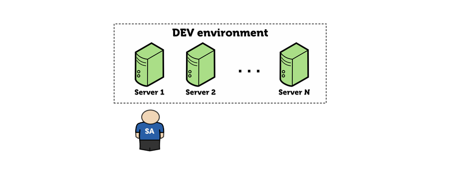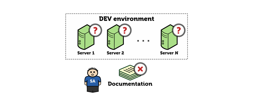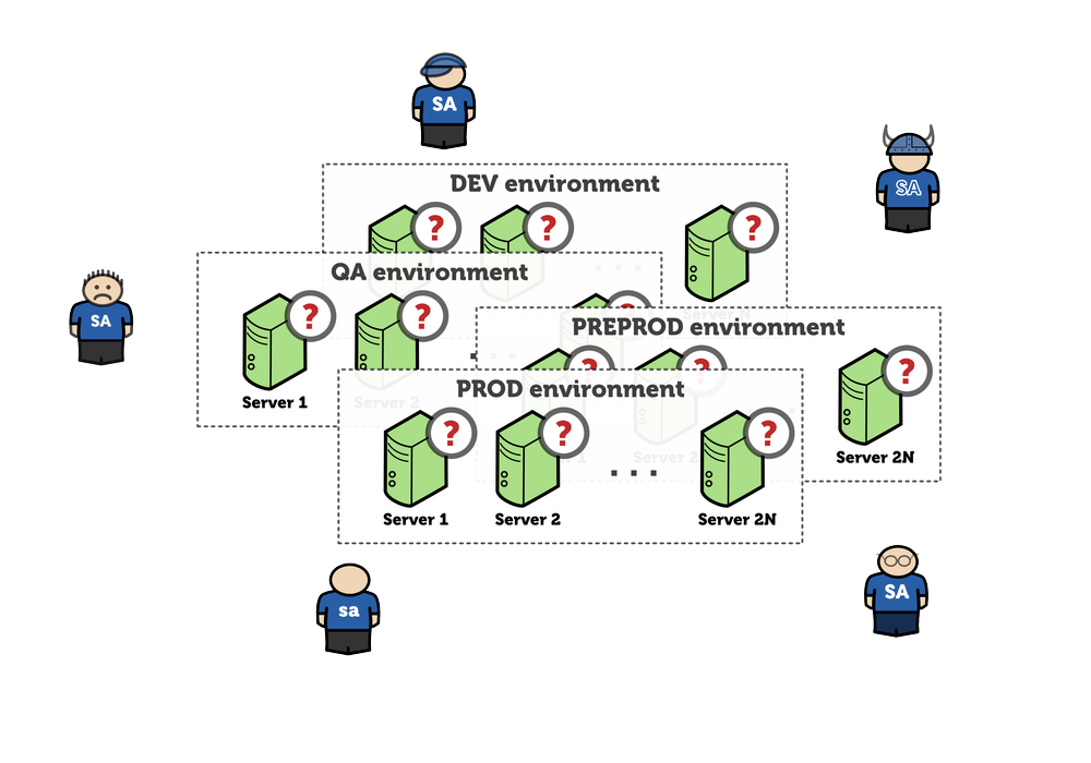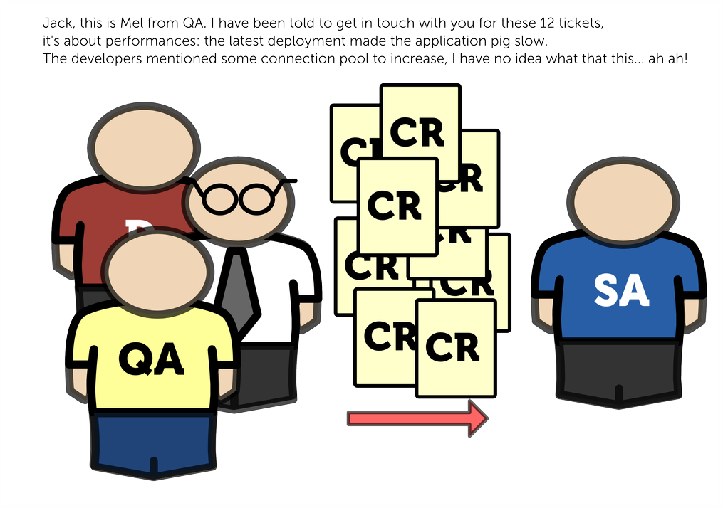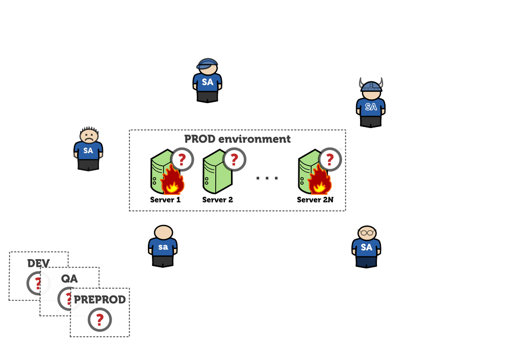 Lucrurile se înrăutățesc în timp. Din ce în ce mai multe solicitări de modificare intră în sistem. Constatând că procesul de modificare a infrastructurii este lent, dezvoltatorii încep să efectueze personal unele modificări pentru a accelera lucrurile.