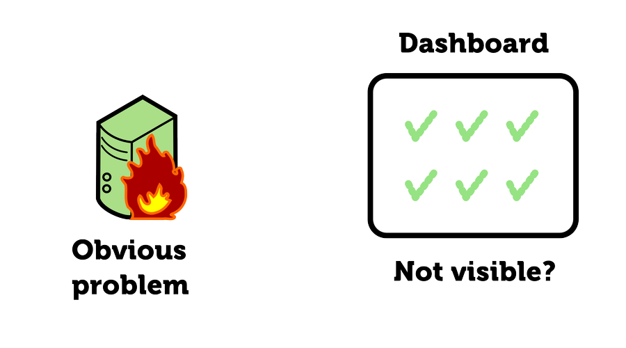 Producția ia foc. Monitorizarea nu ajută. Echipa de operațiuni monitorizează întregul proces ca întotdeauna: încărcarea CPU, disponibilitatea spațiului pe disc, încărcarea rețelei, însă le este străină metrica esențială a aplicației cum ar fi numărul solicitărilor clienților, câte sunt finalizate cu succes, câți clienți activi există în sistem, etc. . Astfel, tabloul de bord este verde mascând problema aplicației: