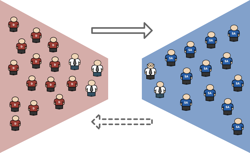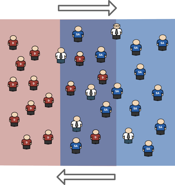 Imaginea de mai sus se aseamănă într-o oarecare măsură cu o echipă de fotbal. Cele două echipe au obiective care intră în conflict, însă respectă anumite reguli ale jocului. Dar adevăratul scop nu este de a învinge cealaltă echipă (deși aceasta implică beneficii pentru departamentul lor), ci de a aduce o bucurie spectatorilor jocului, care, în acest caz, sunt clienții. Nimeni nu este interesat să urmărească un joc, în care o echipă înscrie 20 de goluri iar cealaltă niciunul; nu mulți sunt cei interesați să urmărească un joc în care toți jucătorii sunt sancționați cu cartonașul roșu din cauza unei conduite necorespunzătoare. Atunci când rivalii cu un nivel aproape egal manifestă cele mai bune aptitudini și demonstrează fair-play și respect, jocul va rămâne în memoria spectatorilor ca ceva captivant și care merită văzut.
