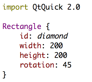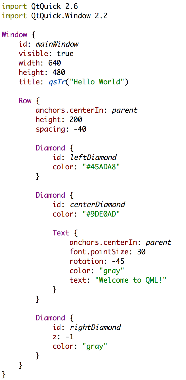 Diamond este un obiect customizat care are anumite dimensiuni și o rotație. În main.qml există mai multe obiecte care se întrepătrund (nested objects) formând o ierarhie.