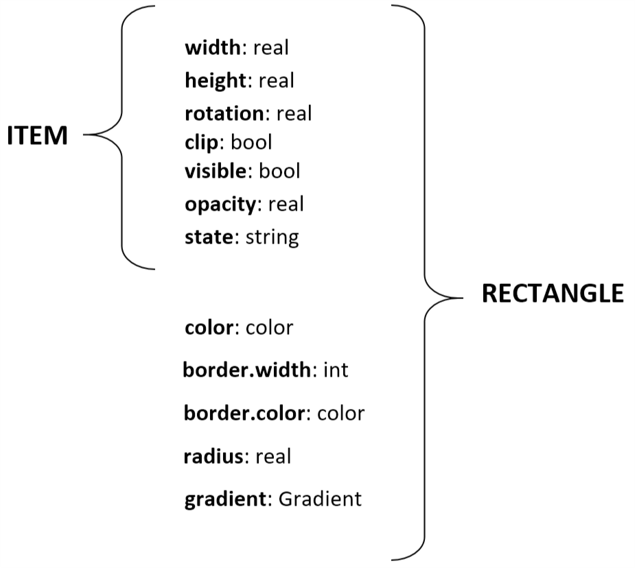 Principalele obiecte pe care limbajul QML le oferă sunt Item, Rectangle, Image, MouseArea, Flickable, Row, Column, Text. Fiecare obiect are o listă de proprietăți proprii, dar are acces și la proprietățile obiectului pe care îl moștenește.
