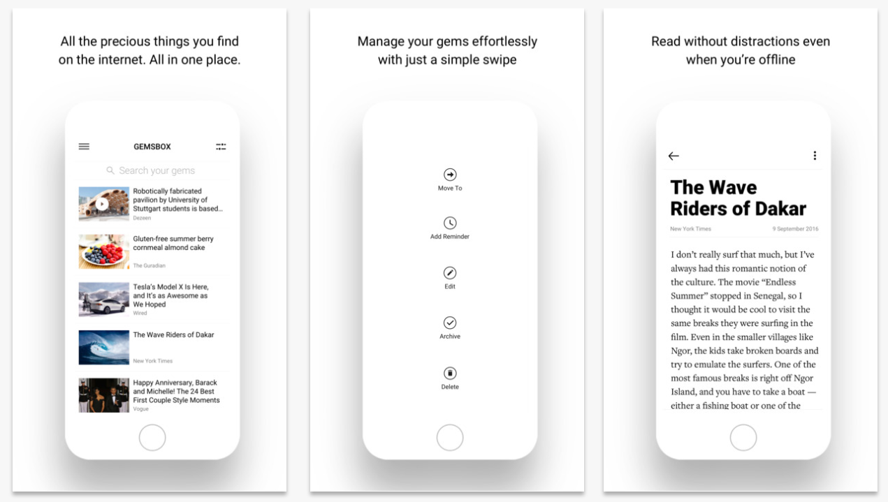 Gemsmark - "O modalitate mai bună de bookmarking". Gemsmark este locul pentru toate lucrurile interesante pe care le găsiți pe Internet, de la articole și videoclipuri la pagini web întregi. Odată salvate, acestea pot fi accesate oriunde și oricând, chiar dacă sunteți offline.
