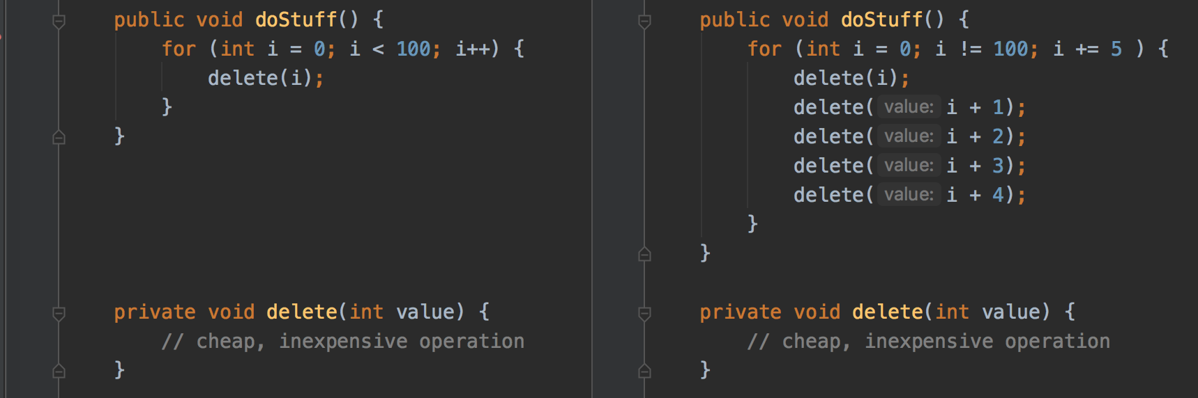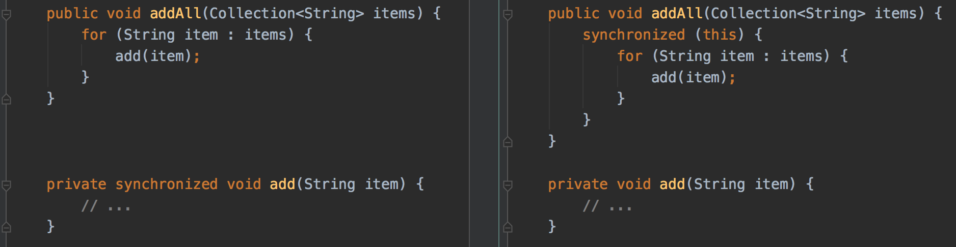 Lock coarsening. Când eliminarea lockului nu este o opțiune, câteodată JVM-ul recurge la unirea multiplelor blocuri sincronizate (pe același obiect), apelate la mică distanță una de cealaltă. De exemplu, o metodă sincronizată apelată într-o buclă. Considerând cât de mare e costul intrării și ieșirii dintr-un bloc sincronizat (proces mediat de OS, cum am amintit anterior) și cât de mare e ignoranța programatorului Java obișnuit față de acest lucru, această tehnică poate fi una foarte eficientă în practică.