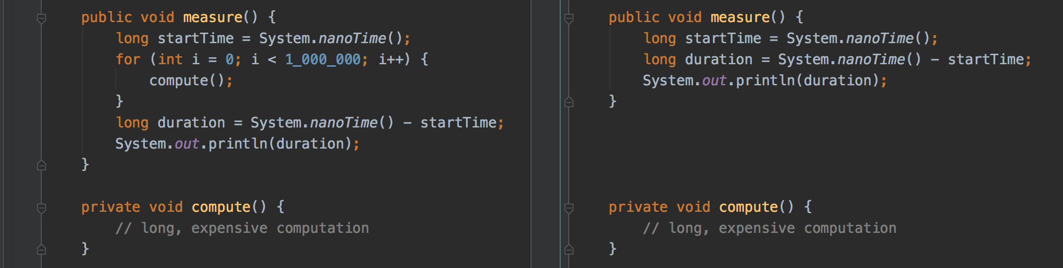 Eliminarea codului mort. În codebase-urile reale există multe bucăți de cod, apărute prin refactorizări repetate, neglijență și alte motive care nu influențează de fapt rezultatul execuției. De exemplu, un contor pe care îl incrementăm într-o buclă pentru fiecare iterație, dar după ce ieșim din buclă nu-l mai folosim la nimic. De multe ori, astfel de cod poate fi și este detectat de JVM și eliminat complet, lucru care de obicei ajută mult la performanță. Aș putea chiar să zic că a nu rula deloc o bucată de cod e îmbunătățirea supremă de performanță care se poate aduce respectivului cod... Există însă și cazuri când această optimizare ne poate cauza bătaie de cap.