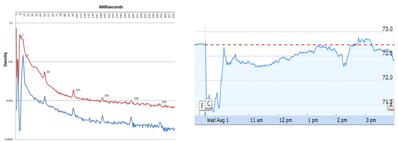 Exemplificăm în Fig.1, a) activitatea algoritmilor pe market urmărind timpul de răspuns al tuturor participanților după evenimentele de tip salt de preț pe parcursul unei zile. Putem vedea în grafic împărțirea actorilor: activitatea la 1 milisecundă distanță de la eveniment e cel mai probabil parte din ce a generat salturile, apoi la 4-6ms sunt cei aflați în imediata proximitate a exchange-ului, și care au un avantaj semnificativ față de ceilalți, restul actorilor începând să aibă latențe începând din intervalul 10-15ms până la sute de milisecunde. Observăm și algoritmii care acționează pe bază de timp și care par a fi activi la fiecare 50ms. Comparativ, viteza de reacție umană are un vârf al distribuției undeva în zona 250-300ms. În Fig. 1.b) putem vedea un eveniment special neașteptat (meltdown datorat unui algoritm de trading) cu efecte mari pe termen scurt, dar care la finalul zilei deja devine nesemnificativ ca impact.