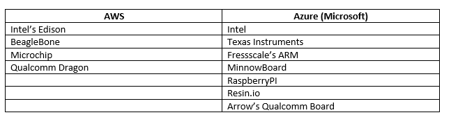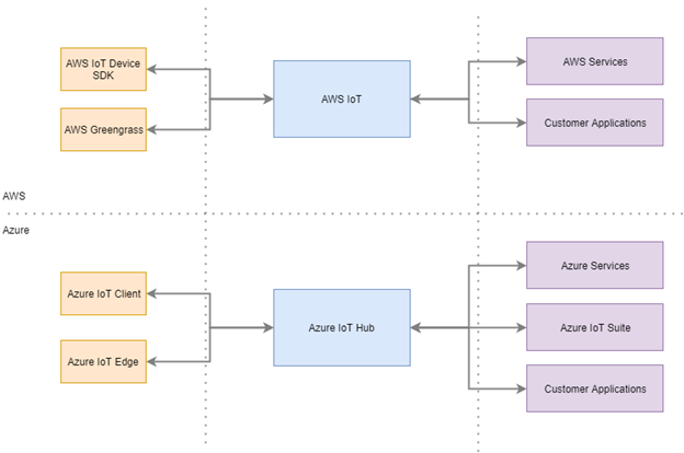 Haideţi să analizăm soluţiile oferite de Amazon și Microsoft. Ambii furnizori oferă un hub folosit pentru a stabili și facilita comunicarea dintre dispozitive și sistemele backend.