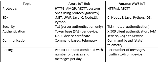 Este interesant modul în care se poziţionează acești furnizori față de IoT. Ambii se axează pe telemetrie și colectare de date de la dispozitive. Deși există suport complet pentru comunicare (comenzi și notificări) din backend spre dispozitiv, nici unul din ei nu oferă o comunicare în timp real, existând limitări din perspectiva numărului de mesaje care pot să fie schimbare cu fiecare dispozitiv în parte.