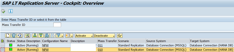 RS_REVOKE_ACCESS - retractează/anulează aceste drepturi.În continuare, prezintă interes tranzacțiile LTRC (Landscape Transformation Replication Server Cockpit) și LTRS (Landscape Transformation Replication Server Settings), cu ajutorul cărora vom specifica individual, tabelele care trebuie replicate, ce set de date trebuie replicat și sub ce formă. Folosind aceeași conexiune la baza de date, putem avea mai multe procese de replicare - intervine conceptul de Mass Transfer ID, în care grupăm o suită de tabele, de exemplu, după anumite criterii funcționale. Un Mass Transfer ID are nevoie de minim patru procese de tip background (BGD WP), disponibile în sistem pentru a executa joburile standard SLT: