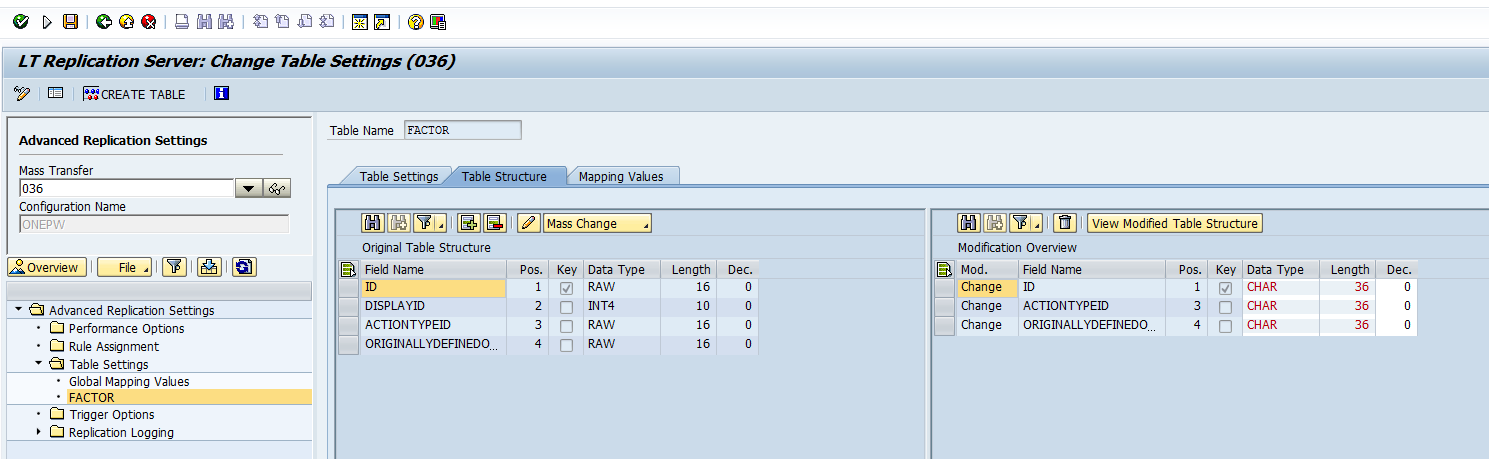 Setările individuale pentru tabele trebuie specificate din tranzacția LTRS. Avem opțiunea să preluăm toate câmpurile din tabela sursă sau să omitem unele câmpuri. De asemenea, putem construi reguli de mapare a structurilor, simple (de ex., maparea unui RAW16 folosit pentru identificatori unici pe un NVARCHAR36) sau complexe (de ex., aplicarea unor patternuri înainte de scrierea datelor în tabela destinație, cu mențiunea că nu este recomandat să efectuăm calcule aici, ci în HANA, din rațiuni de performanță).