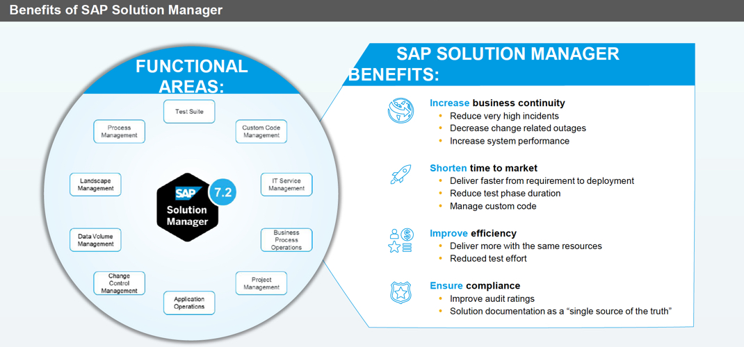 SAP Solution Manager este o platformă SAP ce gestionează ciclul de viață al unei aplicații (application lifecycle management - ALM). Aceasta vă ajută să implementați, să mențineți, să rulați și să integrați toate aplicațiile enterprise - chiar și software non-SAP - facilitând inovația, continuitatea și operațiunile business.