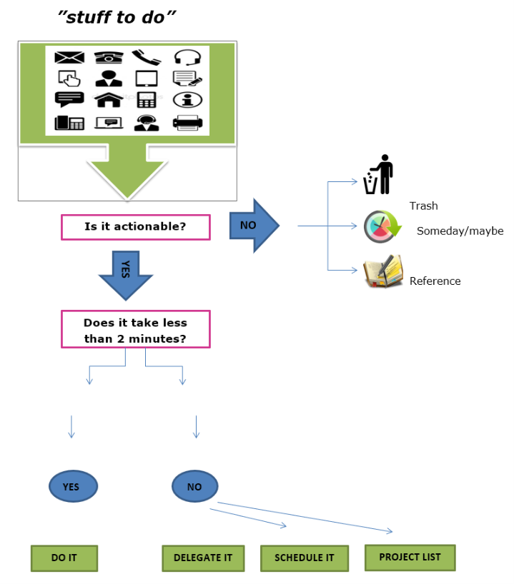După colectarea tuturor sarcinilor, începem organizarea lor, după următorul criteriu: este acționabil - se poate face ceva acum - în viitorul apropiat? Dacă răspunsul este nu, luăm informația și => o aruncăm => o incubăm (nu este necesară o acțiune acum, dar s-ar putea să fie mai târziu) => o încadrăm ca referință (posibilă informație folositoare care s-ar putea să ne fie de folos în alt context). Dacă răspunul este da => decidem următoarea acțiune necesară.