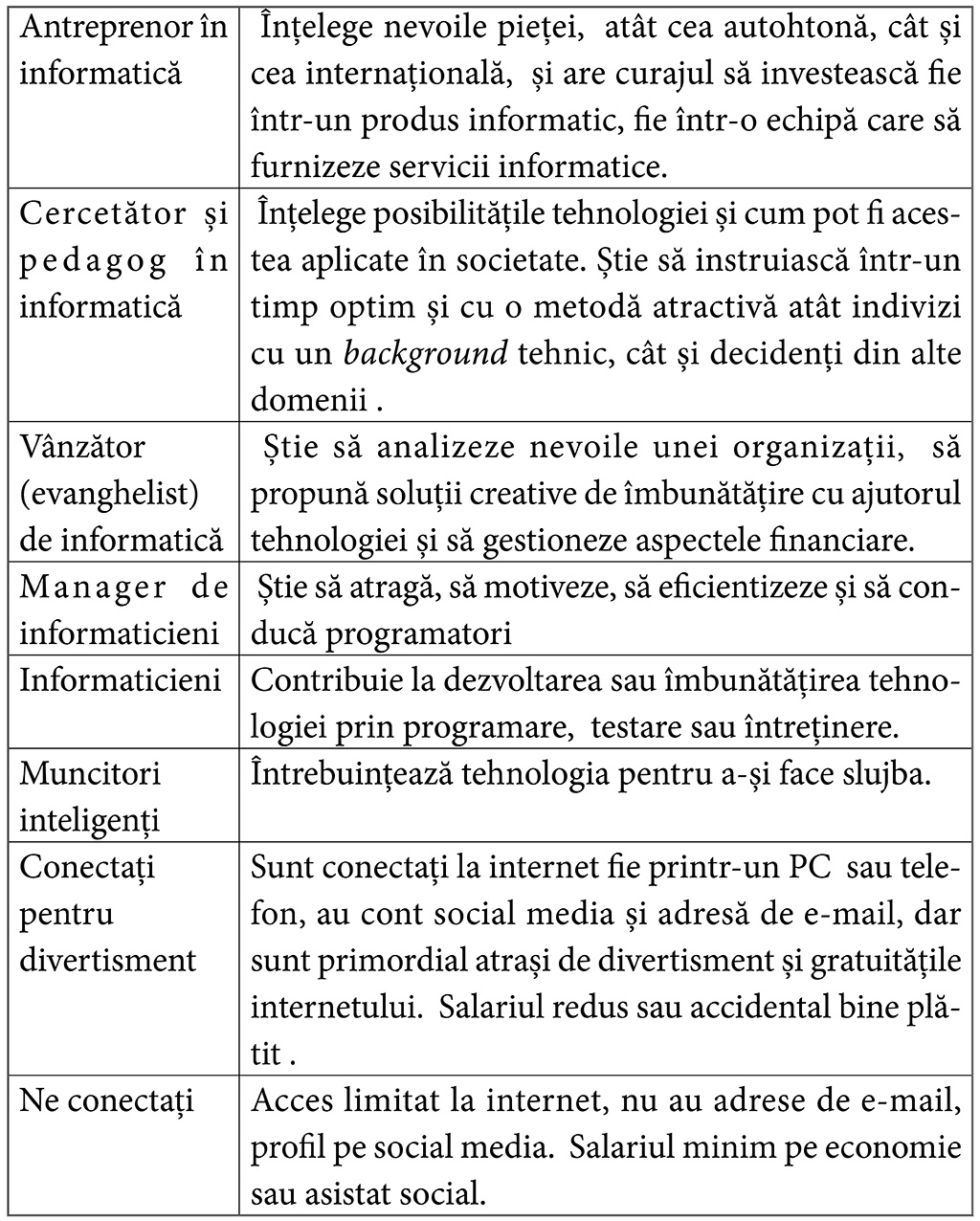 (știință, tehnologie, informatică și matematică). Învățământul formal și teoretic trebuie completat de învățământul informal și de ceea ce numesc eu "ucenicie în tehnologie". Un echilibru sănătos trebuie atins între profesori, mentori și spațiul fizic unde această ucenicie se desfășoară. România este deficitară la managementul resurselor didactice, ca urmare recomandarea noastră să se acorde o atenție sporită interacțiunii umane. Fiecare oraș ar trebui să promoveze profesorii și mentorii care tehnologizează populația, prin recunoaștere publică și prin remunerare financiară. Mai mult, fiecare oraș ar trebui să aibă cel puțin un laborator public de informatică per 10.000 de cetățeni, laboratoare unde firmele de specialitate și-ar putea investi resursele de CRS (responsabilitate corporatistă socială) pentru a transfera cunoștințele lor către populație. În final, problemele sociale ar trebui prezentate public și transparent, cu o invitație de implicare atât a cetățenilor prezenți cât și a diasporei orașului în vederea rezolvării problemelor. Mai jos, veți găsi un tabel care ilustrează felul în care considerăm că se împarte populația și relația pe care o are aceasta cu tehnologia. Cea mai importantă categorie pentru durabilitate economică și socială sunt "muncitorii inteligenți", care găsesc noi întrebuințări a tehnologiei pentru munca lor de zi cu zi.