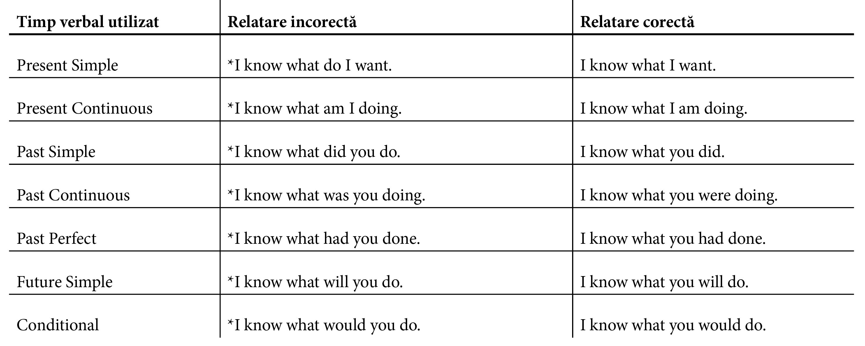 Nu suntem toți lingviști, deci e ușor să considerăm că nu există diferențe între (12.1.) și (12.2.). Deoarece noi considerăm că structura internă a întrebărilor și a relatărilor din limba română este identică (ceea ce este greșit), iată ce se va întâmpla în engleză, în mod greșit.