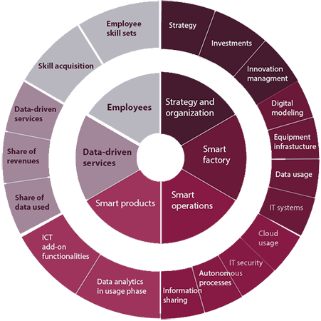 Dimensiunea Smart factory (Fabrică inteligentă) investighează gradul în care compania are sisteme cyber-fizice integrate digital și automatizate. O fabrică inteligentă (SF) este formată din sisteme de producţie și logistică ce se organizează fără intervenţie umană. SF conectează lumea fizică cu lumea virtuală prin intermediul sistemelor cyber-fizice (CPS) care comunică printr-o infrastructură IT numită și Internet of Things (Internetul Lucrurilor). Prin urmare, SF permite utilizarea eficientă a resurselor.