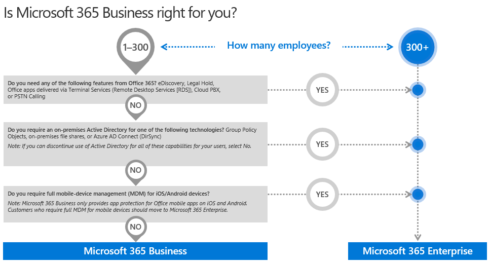 Diferența între cele două tipuri de licențe este făcută prin asocierea platformei M365 Bussiness exclusiv cu Azure Active Directory, fără posibilitate de integrare în medii hibride, platforma fiind orientată spre simplificarea procedurilor administrative necesare activării, implementării și configurării facilitaților incluse.